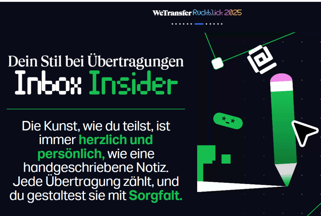 - Die von mir verschickte Datenmenge via WeTransfer: 28,2 GB (das sind 20.024 Disketten, 1.154 E-Mail-Anhänge und 42 CD’s). Ich wurde quasi zum Blockbuster in der WeTransfer-Welt. Wer hätte das gedacht, dass das mein Arbeitstool Nummer Eins werden würde.